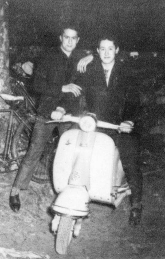 Quizás por la tratarse de una escena nocturna y la consiguiente falta de luz, quizás porque la foto la sacó alguien poco diestro en el arte del enfoque o quizás porque a esas horas el fotógrafo iba bastante "hidratado"... la calidad de esta instantánea deja mucho que desear. Pero aquí dejamos al carpinteiro Antonio Domínguez, de Campo Lameiro, vestidos de fiesta, posando con una vespa.