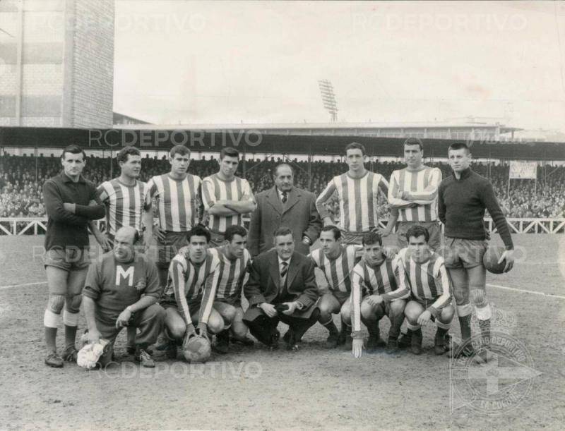 Formación del Deportivo el 25 de marzo de 1962, día en que logró el ascenso a Primera División pese a perder en Garellano, campo del Indautxu (2-0), en partido de la 29ª jornada del Campeonato de Segunda División Grupo Norte de la Temporada 1961-1962. De pie, de izquierda a derecha: Emery, Aurre, Lariño, Pegaso, Jesús Cebrián Brizuela (presidente), Domínguez, Manín y Pampols. Agachados: Cucarella (masajista), Gento II, Amancio, Juan Otxoa (entrenador), Veloso, Jaime Blanco y Bellón.