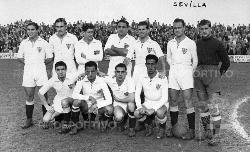 Formación do Sevilla FC na súa visita ao Deportivo no Parque de Riazor, na 13ª xornada do Campionato de Primeira División da Tempada 1942-1943. O encontro disputouse o 27 de decembro de 1942 e concluíu con empate a un gol. De pé, de esquerda a dereita: Félix, Eguiluz, López, Campanal I, Joaquín, Villalonga e Busto. Agachados: Iturbe, Mateo, Alconero e Berrocal.