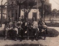 A su lado, podemos ver al que fue su alumno más destacado: Alfonso Galbán Rico. Recuerdo el día en que, como tantas veces, estando en casa de la familia Galbán-Rico ojeando unos cuadernos de música, encontré una partitura que llamó mi atención. Se trataba de un pliego de papel pautado, de una textura fuera de lo corriente, en el que los pentagramas de sus cuatro carillas aparecían cubiertos con las correspondientes notas, figuras, alteraciones, armadura, claves, compás…
