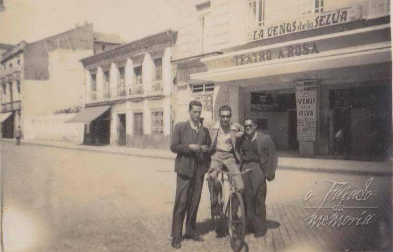 Tras os tres amigos na bicicleta, o chan era de adoquin, tras eles o cine Arosa anunciando unha pelicula de Maria Montez, vemos tamen a caniceria de Palliñas. Recuperando o noso pasado
