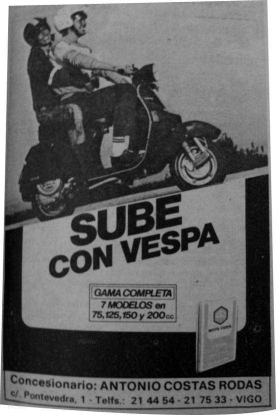 Recorte de un anuncio de prensa publicado en Faro de Vigo a principios de los años 80, en el que "VESPA COSTAS" se publicita como concesionario vigués. Es preciso indicar que esta casa, referente en la historia del vespismo vigués, ha declinado colaborar con este proyecto. De todos modos, contamos aquí con varios testimonios gráficos en los que podemos plasmar su estrecha vinculación con las pruebas de velocidad y resistencia.
