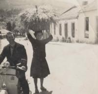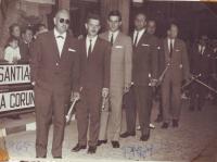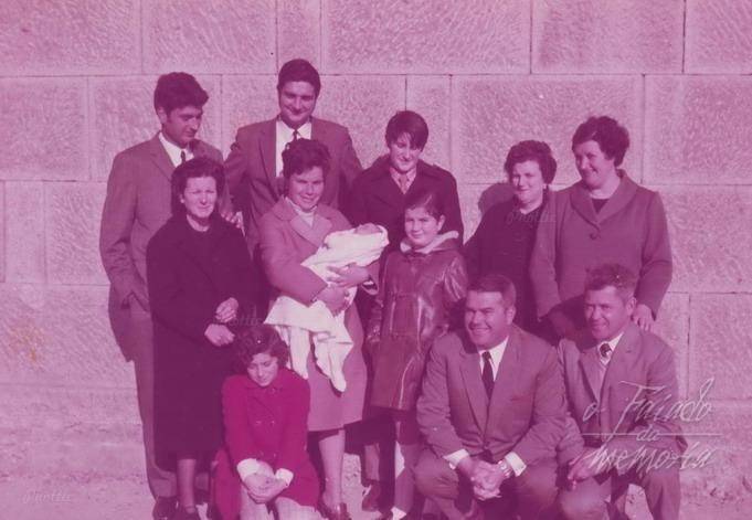 Creo que a foto corresponde ó bautizo da miña prima Mª José. Aparecen Moncho (o pai), seu irmán Jesús, eu, miña avoa otilia, miña nai Tilucha. Logo miña tía Dorinda, Marujita co bebé, a filla de Santiso (non lembro o seu nome). Agochados: A miña irmán Beatriz, Santiso, e o meu pai Joaquin Abuín.