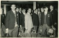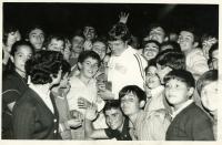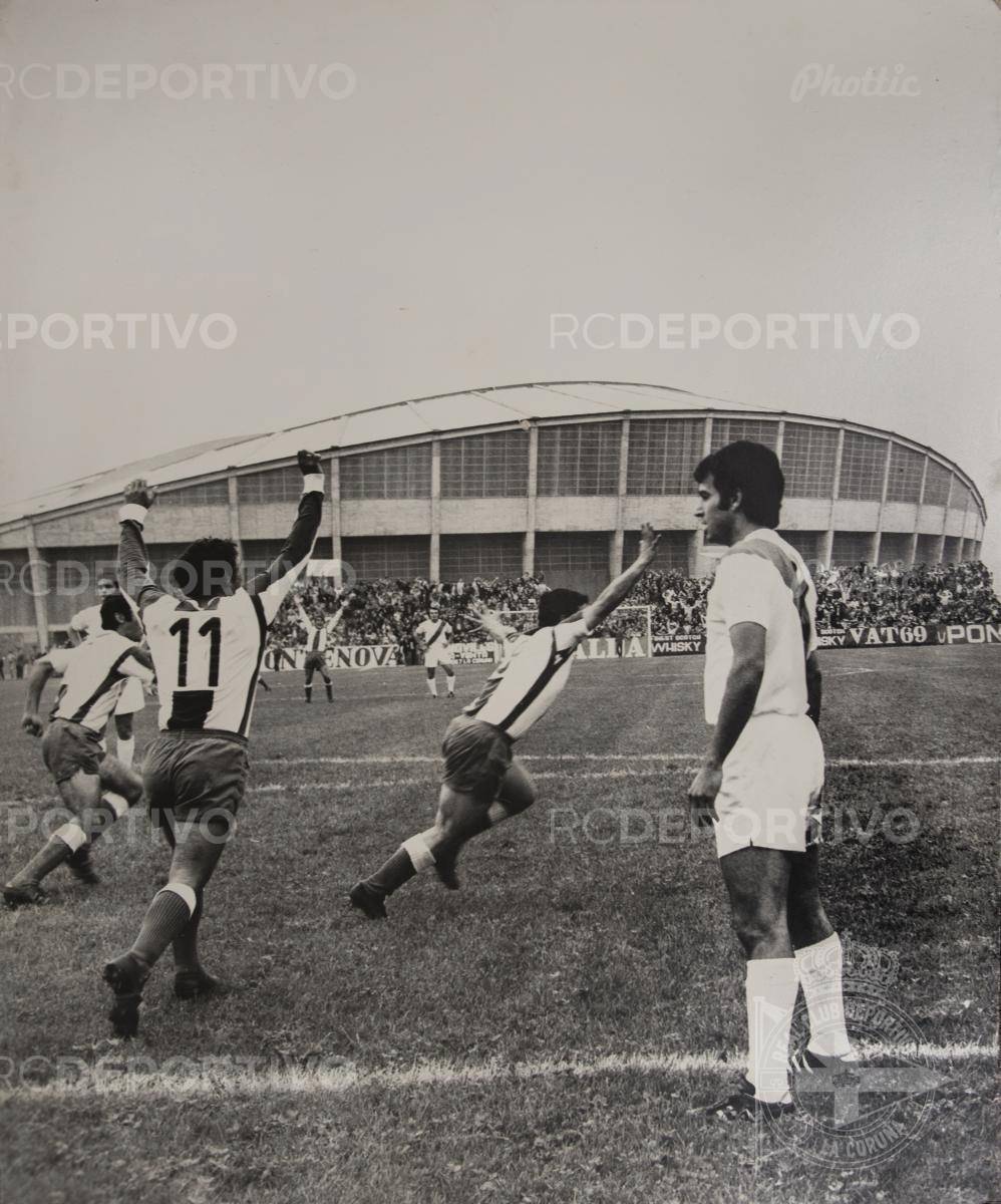 Beci (centro) celebra o gol que acaba de marcar ante o Rayo Vallecano ante a alegría de Loureda (esquedar) e Juanito (11) e a desolación de Aráez (dereita), o 6 de xuño de 1971 no estadio de Riazor, no partido da 38ª e última xornada do Campionato de Segunda División da Temporada 1970-1971. O Deportivo venceu ao equipo madrileño con ese solitario tanto e logrou o ascenso a Primeira División.