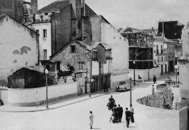En el muro de la izquierda se colocaban los anuncios de los cines y un buzón del Banco de los Pobres. Ya no está el taller de Quina, pero sí están la casa del Arousán, la de Doña Patrocinio, con su característico balcón y la de la Imprenta Quintans, ambas aún resisten hoy en día. Cándido