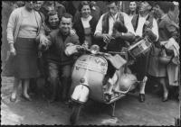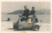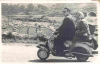 José Juan Bao Besada. Foto tomada en Torneiros, O Porriño, a principios de los años 60. Junto a Horacio Martínez y su hermano, compraron las Lambrettas recién llegados de Venezuela. Para sus desplazamientos cotidianos y como buenos "indianos", para presumir que la emigración les había sentado muy bien. En una ocasión, se desplazaron los tres hasta la localidad de A LAMA, a entregar un paquete. A mitad de trayecto, una patrulla de Tráfico les dio el alto. No porque hubiesen infringido ninguna norma de circulación, si no por el hecho de ver tres motos iguales rodando juntas. La primera reacción de los agentes fue un espontáneo: "Caray, ustedes con esas máquinas llegarán hasta el fin del mundo". Cuando llegaron a A LAMA, la gente del pueblo pensó que eran los ingenieros de Caminos, que les iban a arreglar las carreteras.