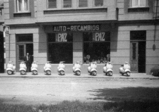 Fotografía de Auto-Recambios, Concesionario Oficial de Vespa en la ciudad de Ferrol. Llaman la atención los dos carteles con la palabra "PAZ" que presiden el establecimiento. Según cuenta Gonzalo Antón (hijo de David Antón Costas, propietario de este establecimiento y Presidente del Vespa Club Ferrol durante unos años) no tenía precisamente un desinteresado matiz pacifista. Se trataba de una, llamémosle "recomendación" del régimen Franquista, con muchos arraigos en la ciudad, con motivo del XXV aniversario de la victoria del Generalísimo y por consiguiente, "estado de Paz que se respiraba en España".