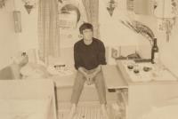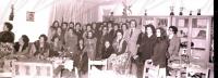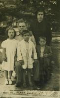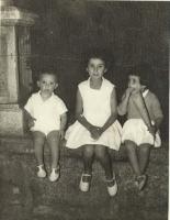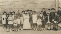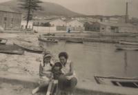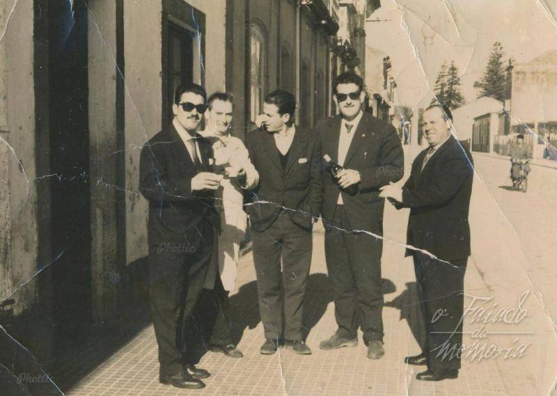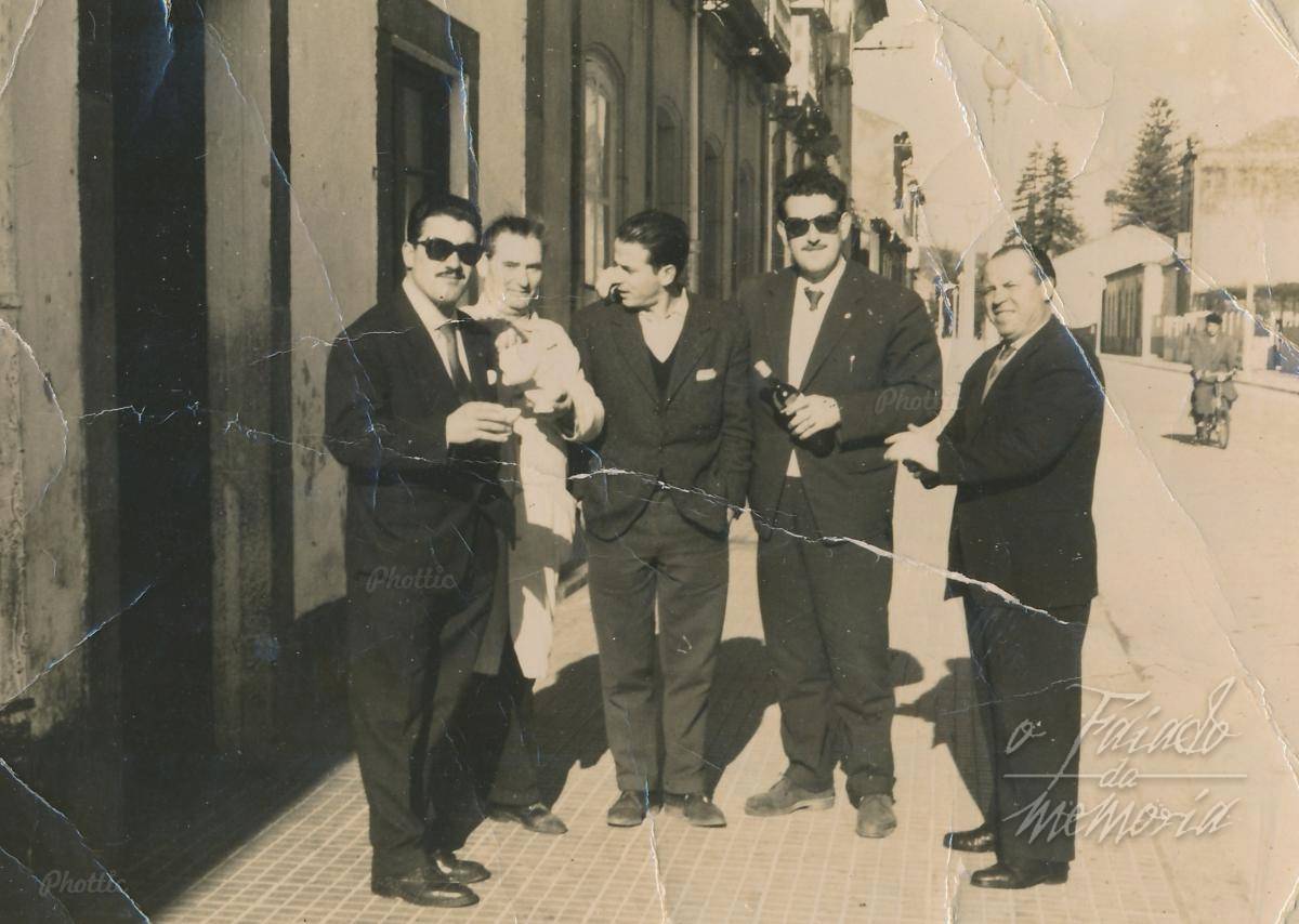 Enrique Campos, na porta do seu bar, con tres persoas que chegaran de fora a xestionar a carga do afundimento do Cabo Razo, con eles a dereita Fresco o taxista que vivia en Trabanca Sardiñeira