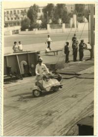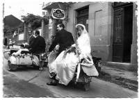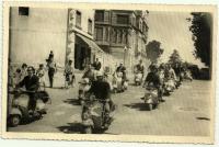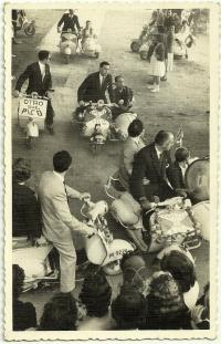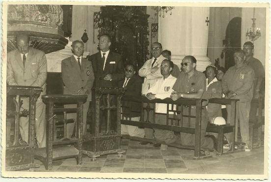 Misa en honor a la Patrona de Tetuán (Nuestra Señora de África) con motivo del Rally de Andalucía en Vespa. La fotografía está tomada el 18 de julio de 1963 y en ella aparecen arrodillados Julián Mouriño (de camisa Blanca) como Presidente del Vespa Club Vigo y a su izquierda, el Presidente del Vespa Club Pontevedra Joaquín González (con camisa de manga corta oscura). Indicar que el Teniente Alcalde de Tetuán por aquella época era Gallego y recibió a la comitiva gallega a cuerpo de Rey.