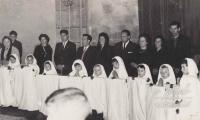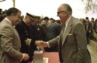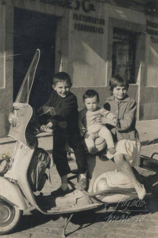 Na rua Colon en Santa Lucia, na vespa Marisa e Carlos Cuevas, tras eles a consignataria de Conde, ali traballaban Abrahan Gamarra e Samuel Bugallo