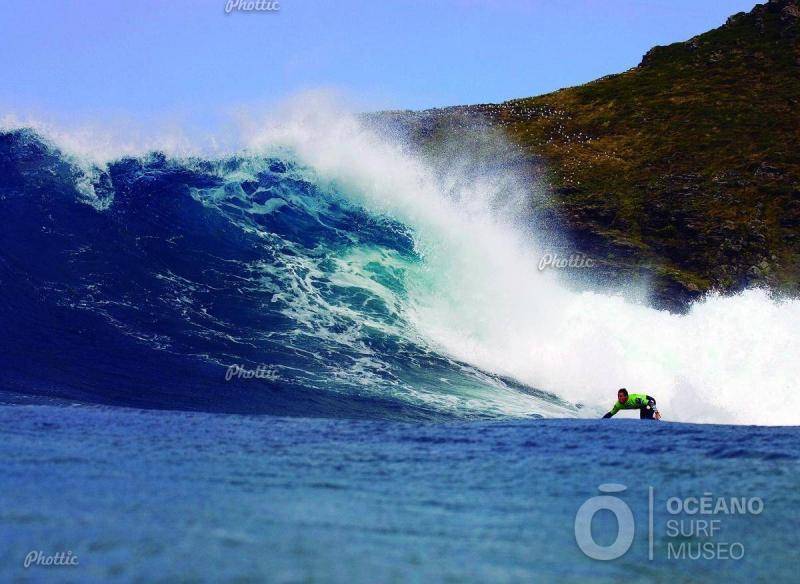 Un surfista, sin identificar, realizando su prueba en el Pantín Classic de 2008. Ese año se volvió a cumplir la norma según la cual en todos los años que terminan en 8 habrá grandes olas en el campeonato.
