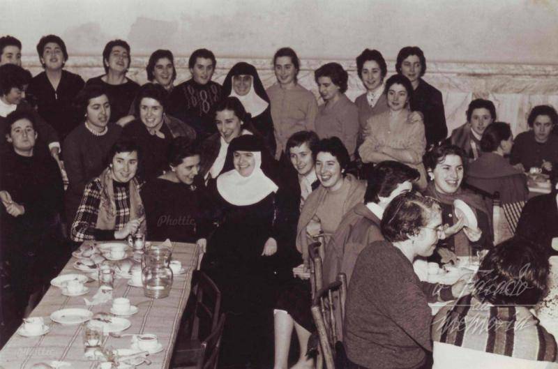 No comedor, antigas alumnas de visita no colexio, Margarita Porto, Fernanda Aguiar, Conchita Lumeras, Olga Sanmartin...