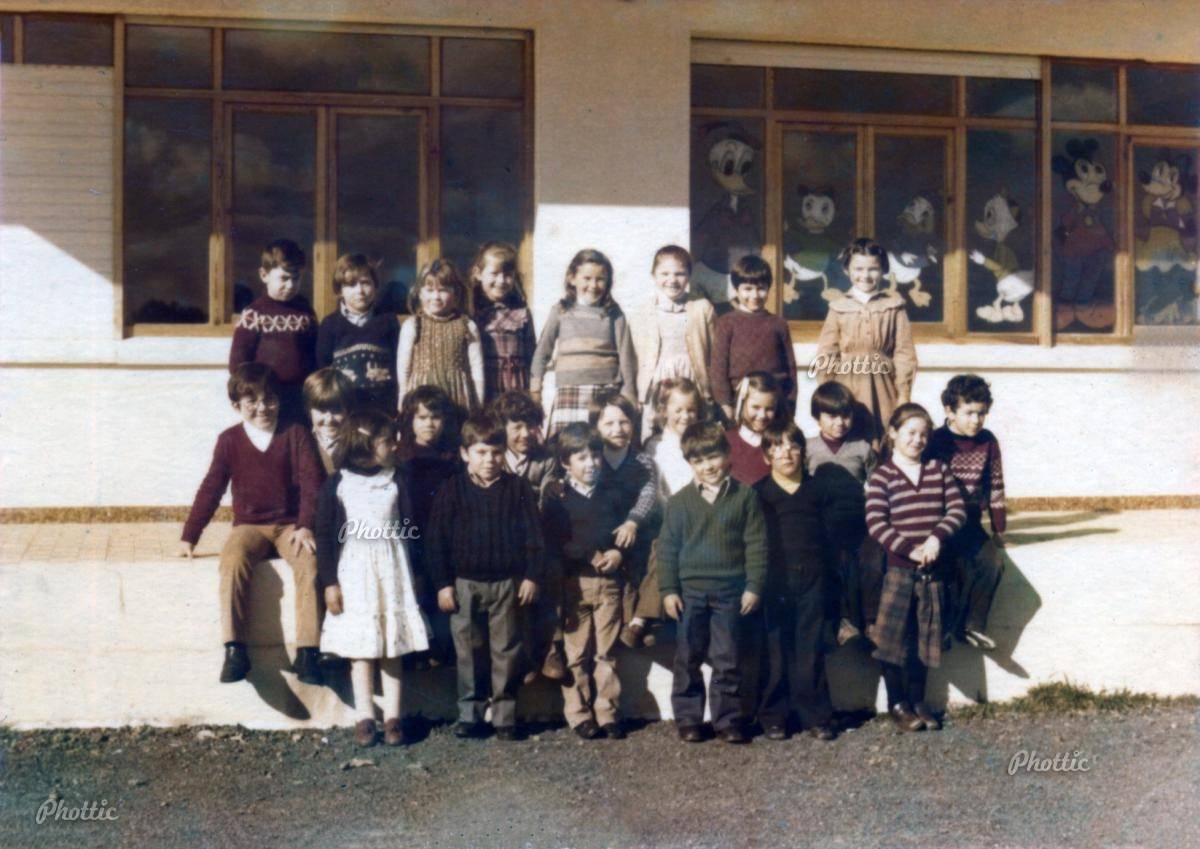 Clase de 1º de EXB dos nenos e nenas nacidos en 1974. De esquerda a dereita de pé: Javier, Alejandro de Julita (Yai), Yolanda, Fátima Martínez, Elena Figueroa, Susana Niebla, José Pazos, Patricia. Na fila de abaixo, Moises Díaz, Marcos Dopico, Susana, Elena, Miguel, Oscar, Raúl Riveira, José Ramón da Rociña, María José, Francisco, Marta (filla da profesora Dna. Purita), José Ángel Muiño, Oscar, Ana e Manuel.