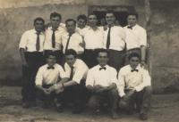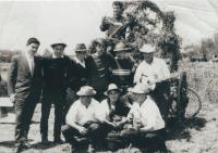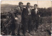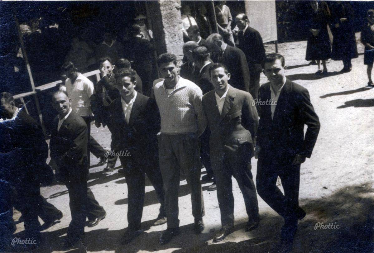 Na procesión da función da Festa de Baltar de 1960. De dereita a esquerda: Horacio de Pereira, Pepe do Carmelo, Pepe de Guerrero e Manolo do Carmelo á altura da Cochera en Baltar.