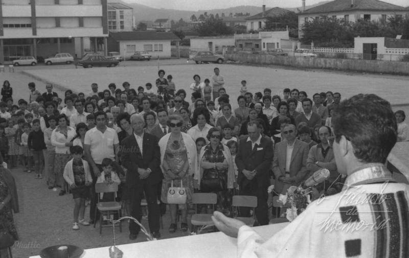 Os Colexios que se fixeron na Lomba, o Francisco Franco e o Jose Antonio Primo de Rivera, compartian patio, a imaxen nos mostra unha misa de Xaime Vaamonde,