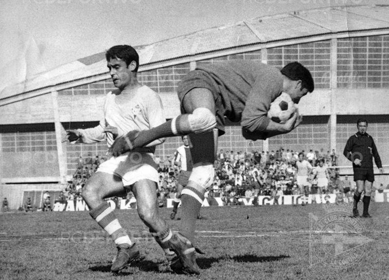Joanet atrapa o esférico ante Gabriel Lezcano, nun lance do encontro da 28ª xornada do Campionato de Primeira División da Temporada 1969-1970, disputado o 5 de abril de 1970 no Estadio de Riazor. O Celta venceu ao Deportivo por 0-1. O recinto presentaba unha pequena bancada provisional no fondo do Pavillón dos Deportes.