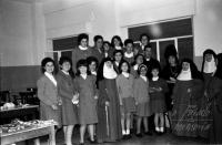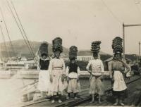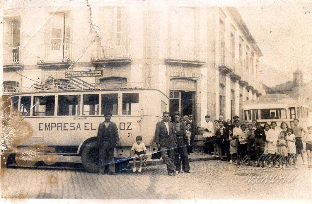 Se pueden observar en el techo del autobús de la izquierda dos filas de asientos para pasajeros, pero no se vé la esclaera de subida. Lo digo, por qué recuerdo a los del Veloz que iban a Pontevedra con este mismo modelo de asiento, pero tenian una escalara incorparada para subirse. Aparte que el bordillo sujetaba los bultos que tambien se llevaban encima. La presencia del sacerdote con el "roquete" puesto habla de una inauguración y bendición y está delante del que despues fué kiosco de Marujita Pacios. Es curioso ver desde el angulo superior derecho a la Iglesia Parroquial