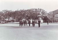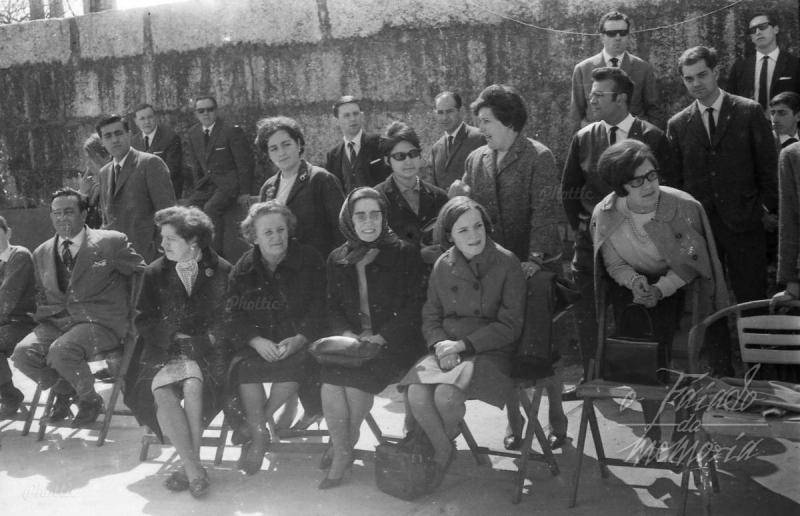 Esta foto fué sacada en el Liceo y al fondo aparece José Luis Rivera y Eduardo Rubianes. Al lado de Resumil, Moncho que sus padres tenian una tienda en la Plaza. El que aparece detrás de el tambien tenia tienda en el mismo sitio y vivia en la Plaza de la Independencia, pero no me viene el nombre a la cabeza. Sentados y por la izquierda, Tucho el fontanero del Ayuntamiento y a los lados de Marujita, la madre y la hermana de Rivera. En la segunda fila está Toñita y Jesús Pérez del Oro. Cándido