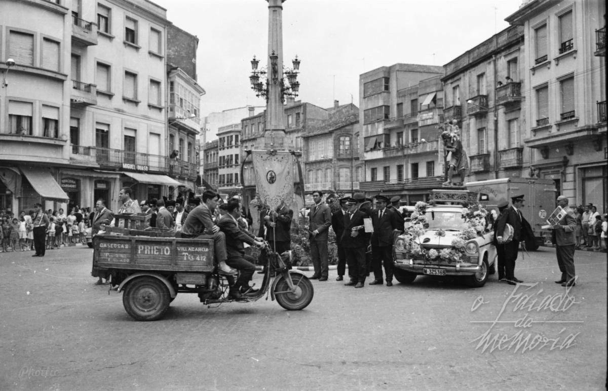No motocarro donde se cargaban as gaseosas vemos a Paco, a fabrica e o almacen estaban na Marina, no barrio de Santa Lucia mismo a veira da rua Colon. A imaxen ´e nunha bendicion de vehiculos o dia do San Cristobal.