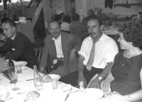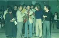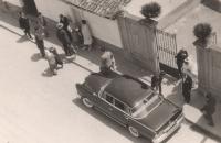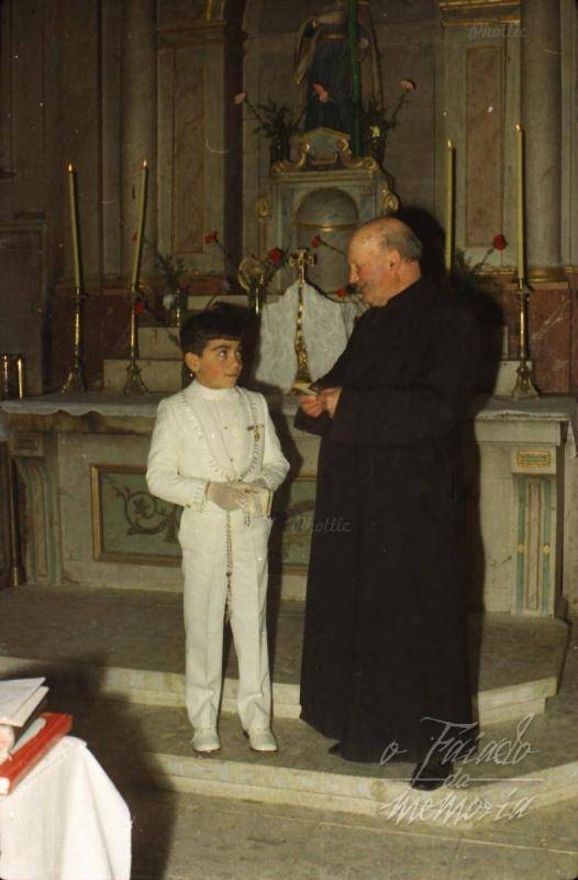 O protagonista da fotografia mira interesado a o cura, tantos anos destiñado na parroquia de Bamio