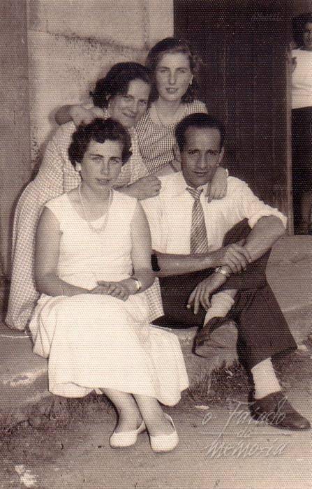 Na imaxen Chitina e Filucha de la Fuente, fillas de Valeriano, profesor de talleres no Instituto e Fefa con un posto de venta de legumbres na Praza de Abastos, na imaxen tamen esta Manolo Galban un dos fillos do Bar Burato