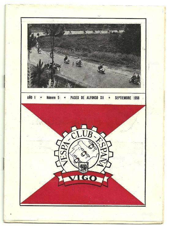 Ejemplar número V de la revista del Vespa Club Vigo, publicada en Septiembre de 1958. De los ejemplares aquí recopilados, es el primero que incorpora una portada propiamente dicha. Con una fotografía y el logo del Vespa Club insertado en una bandera viguesa. Cabe destacar en este número una crítica editorial escrita por el "Capitán Vespo", el programa de actos y salidas previsto para el mes, comentarios sobre otras salidas realizadas, un breve artículo con motivo del primer aniversario del Club, otro sobre el "Rally día de América en Asturias", varias notas de sociedad, una viñeta de humor y varios anuncios publicitarios. Si quieres recibir el ejemplar escaneado, solo tienes que pedírnoslo por e-mail: info@miabuelteniaunaigual.es