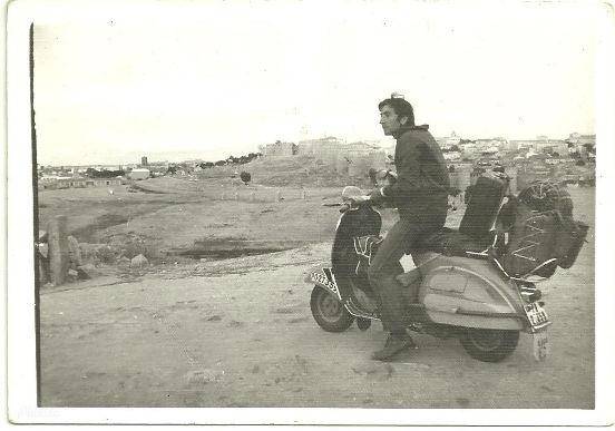 Fotografía correspondiente al primer viaje realizado en Vespa por Benedicto Méndez hasta Ávila en el año 1968, con 18 años de edad. Al fondo se pueden apreciar las murallas de la ciudad. El viaje le llevó 16 horas de camino, en numerosas ocasiones por “corredoiras” a una media de velocidad de 40-50 km/h. Todo de un tirón, como se hacía antes. La ruta realizada fue Vigo-Zamora-Salamanca-Ávila y Segovia. Cuenta Benedicto que… “En aquella época no había tráfico ninguno. Estaba saliendo yo en Puebla de Sanabria cuando de repente un 850 con matrícula de Pontevedra se para delante de mí y me hace parar. Empezamos a charlar, ya sabes, allí en medio de la nada... Hola, Hola, es que soy de Vigo, he visto la matrícula de tu vespa y quería saber si necesitas alguna cosa… no nada, a donde vas y esas cosas… resulta que era el practicante de la Calle Cuba. Años después, fui yo al Ambulatorio y me lo encuentro allí. Anda, pero si yo a ti te conozco. Te acuerdas en Benavente, una vespa a la que paraste por si necesitaba algo… pues era yo".