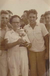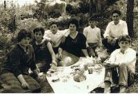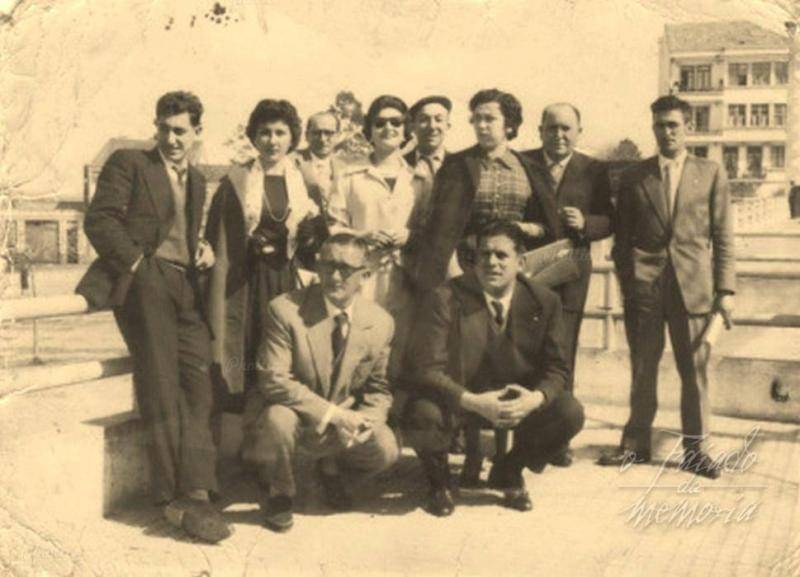 De izquierda a derecha, primero Rañó, la hija de Segundita casada con un apoderado del Hispano, atrás Alfonso Formoso y mi padre y delante de él Josefita Casabella y mi prima Katy Vázquez. Despues el conocido por Tomias jefe de telégrafos y Carlitos Moya. Agachados, José Luis Rey, hijo de D. Jacobo y suegro de Carlitos. Finalmente Manolo López Vázquez, que