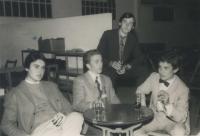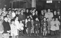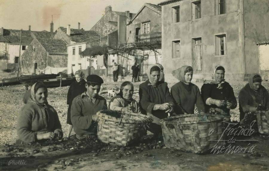 Mulleres, no medio un home do Carril limpando marisco a esquerda Mercedes , a dona de Moncho Berride, tercera pola dereita, Charo a sua filla