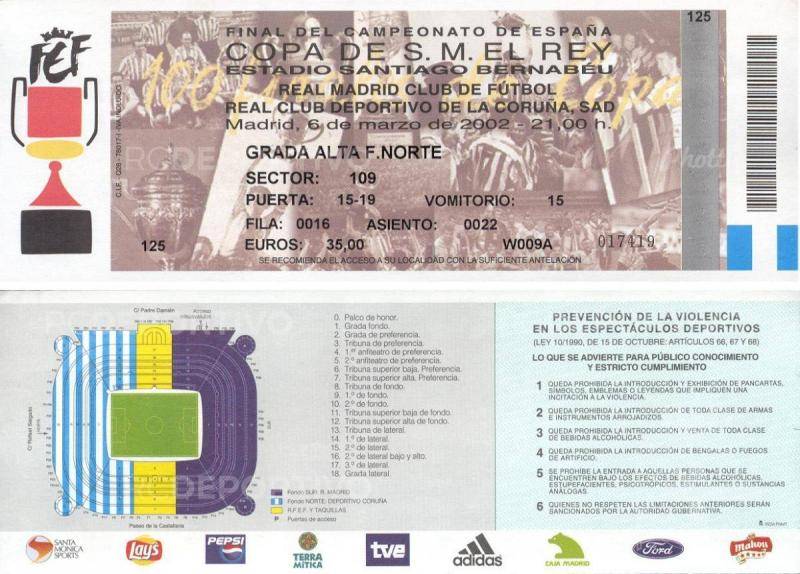 Anverso e reverso da entrada da final da Copa do Rei de 2002, disputada entre o Real Madrid e o Deportivo no estadio Santiago Bernabéu o 6 de marzo de 2002. O Dépor impúxose por 1-2 ao equipo branco, que celebraba ese día os cen anos da súa fundación.
