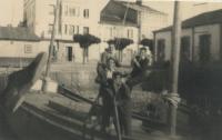 El camión era un cisterna. En primer término,Salvador Abuín que era chófer de camión y supongo que el que llevó el mismo al Ayuntamiento. Despues está Miro Barreiro,que debe representar a la Empresa que lo vendió, pues siempre andaba con los coches. Despues Pepe Redondo,Chantada, José Martinez, Bazaco y Dasilva. Cándido