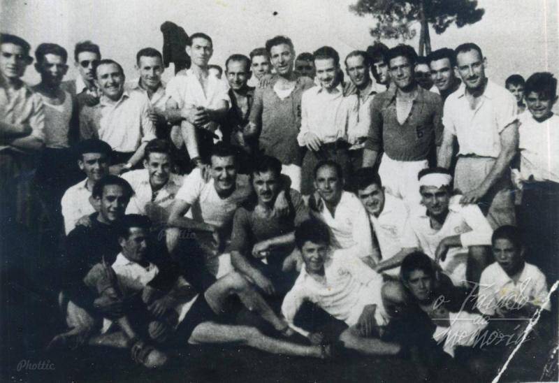 Partido de futbol jugado en la Carballeira pequeña en Marxion fiestas de Agosto 1950. De izquierda a derecha y de arriba abajo : Desconocido, Nano, Quico, Manolo B, Luis, Nicanor Cortes, D Pepe Subela arbitro, Hipolito, Paulino, Luis Arias, Manolo. Abajo, Alejandro, Chino, Cubano, Jano, Tarano, Suso, Nito, Suso Urioste, Manolo, Quin, y Manolito Raño De esta maneira esta escrita a fotografia na sua parte traseira. O Faiado da Memoria