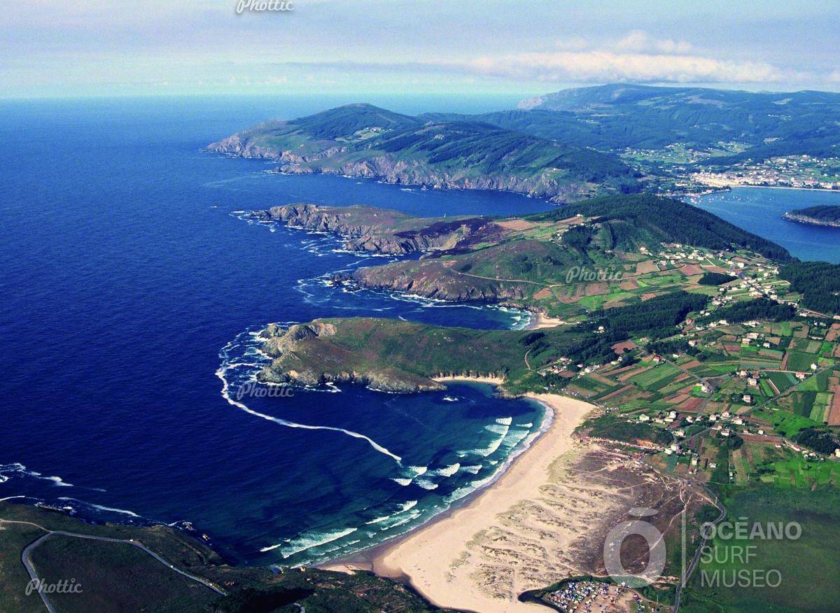 Vista aérea de Pantín. En primer término Punta Corbeira, la playa de Pantín, Punta Gabeira, Punta Oural, Punta Brual, la Ría de Cedeira (con el perfil la villa y la playa de la Magdalena, a la derecha de la imagen) y, al fondo, la línea litoral de la Costa Ártabra.