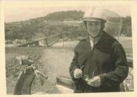 Esta es otra fotografía que inmortaliza nuevamente a los nuevos esposos a la salida del templo, después de celebrado su nupcial enlace. En primer término, la pareja, y a ambos lados del atrio, las Vespas engalanadas para la ocasión con flores naturales y carteles humorísticos diseñados por los compañeros y amigos del VESPA CLUB VIGO.