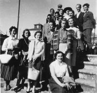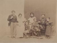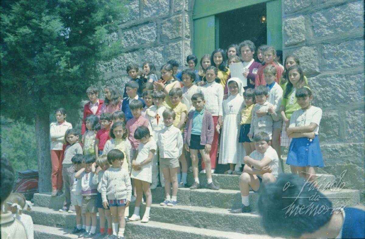 Unha nena e un neno, supoñemos irmas, cos amigos e familiares na porta da igrexa de Guillan