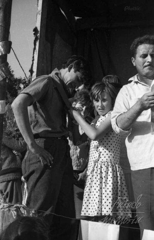Carreiras de bicicletas, o premio as bandas cosidas polas mozas do barrio encargadas de colocarllas a os gañadores. A dereita Jose Briones, botando unha man desde a comision de festas