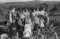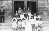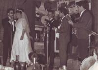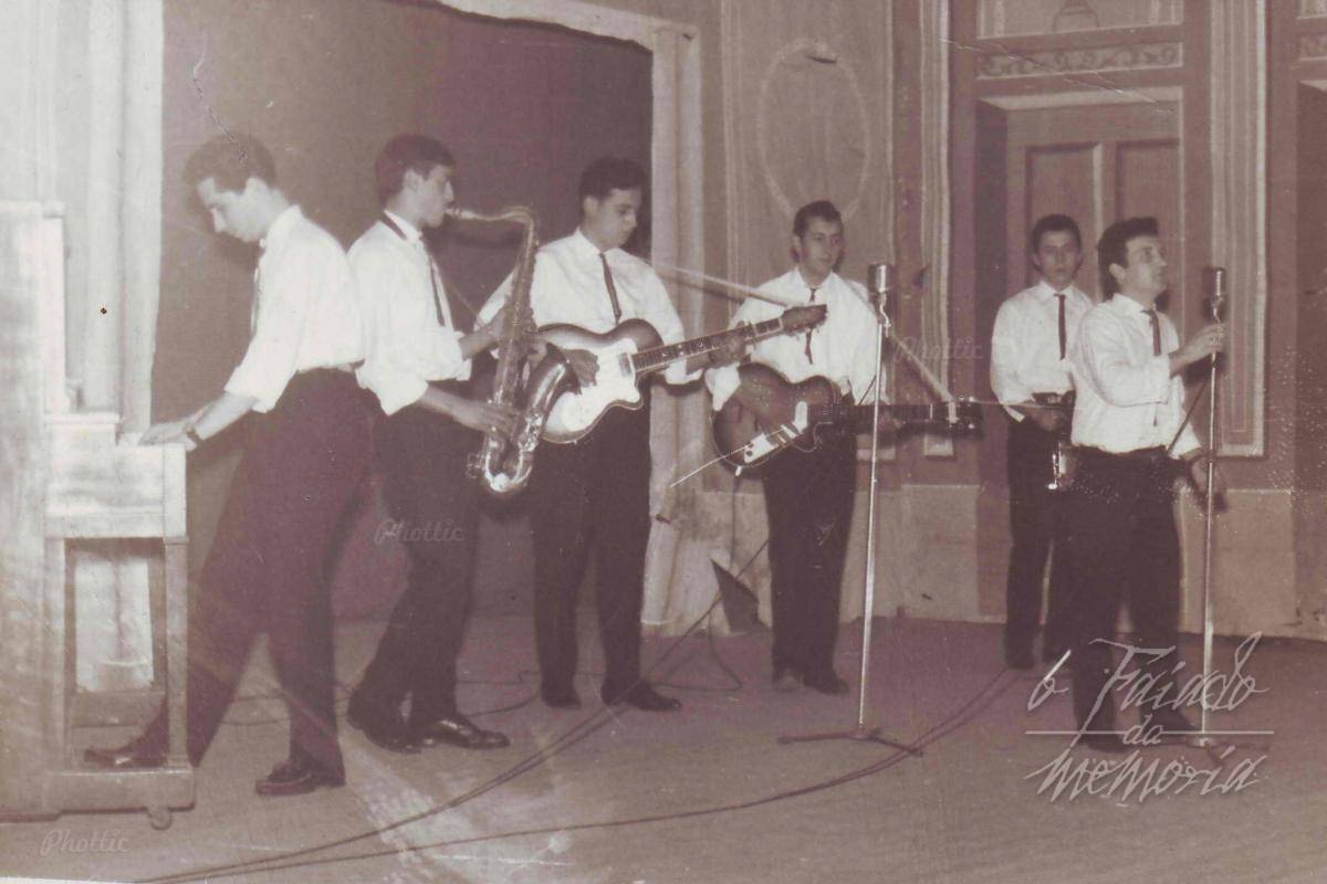 Aqueles artistas de Vilagarcia que empezaron a actuar tan noviños. O solista parecenos Juan Jose Romero, tras el Carlos Puga, Palen, Mingos Rodriguez, descoñecemos o trompetista, por ultimo a esquerda Alfonso Galban