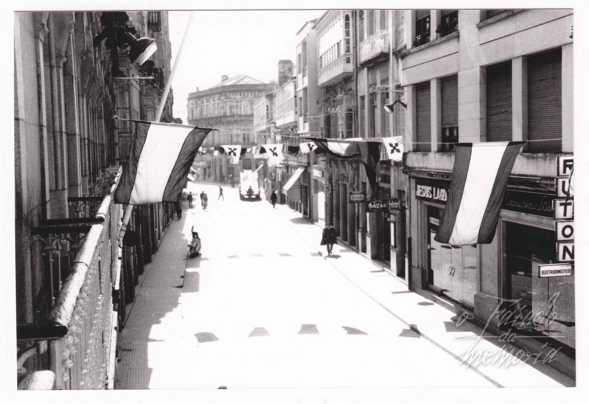 Se movió el ratón. Decía que el primer comercio que aparece en la foto a la derecha y con el rótulo de Ruton es Exclusivas Sainz, en el que trabajó el padre de Varela, el Alcalde. A continuación estaba Lago y Lago, dándose la circunstancia de que ambas firmas eran de La Coruña y vendían géneros similares aún cuando lo fuerte de Lago era la Phillips y de Olivetti la de Sainz. Se daba la circunstancia de que ésta vendía el TV Askar, que era la segunda marca de Phillips y a veces había problemas de competencia, por que incluso los folletos de instrucciones eran comunes. Lo indico como mera anécdota, pues yo trabajé en Sainz, pero nunca hubo problemas por esa vecindad. En este bajo estuvo anteriormente el Almacén de frutas llamado Islas Canarias. Cándido