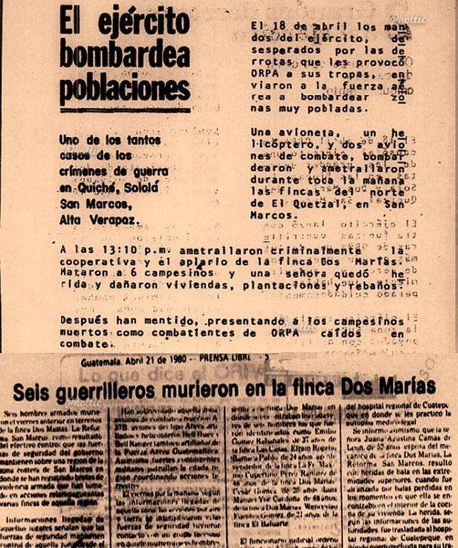 El 18 de abril de 1980, en la zona cafetalera del departamento de San Marcos, tras cruentos combates entre unidades del Ejército Nacional e insurgentes de la Organización del Pueblo en Armas, naves de la Fuerzas Aérea Guatemalteca bombardearon y ametrallaron sobre fincas ubicadas en el municipio de El Quetzal. Por la tarde, de ese día, miembros del Ejército Nacional abrieron fuego indiscriminadamente contra un grupo de trabajadores que se encontraban en la finca Dos Marías del municipio de La Reforma. En el lugar fallecieron 6 campesinos, que fueron reportados como guerrilleros muertos en combate. En este hecho murieron, Emilio Gutiérrez Rabanales (31 años) de la finca Las Casas, Efraín Rogelio Bámaca Pablo (24 años) de la finca La Fe, Wenceslao Fuentes Gómez (21 años) de la finca El Baluarte. Máximo Cupertino Pérez Ramírez (46 años), Luis Manuel Yoc Cardona (48 años) y César Gómez (21 años) de la finca Dos Marías. Resultó herida de bala la señora Juana Agustina Camas. (CEH, Caso 7151).