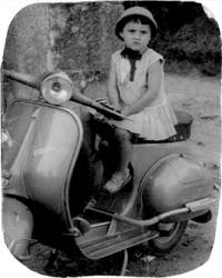 Imagen de una canaria posando en la vespa de Jesús, con la la isla y las nubes como telón de fondo.
