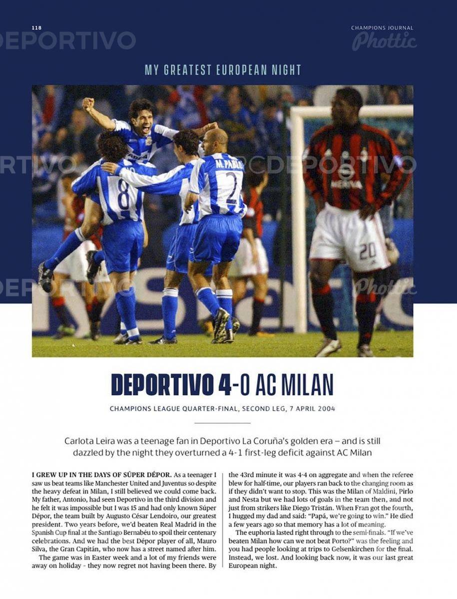 Reportaje sobre la victoria del Deportivo ante el Milan en el encuentro de vuelta de los cuartos de final de la Liga de Campeones de la Temporada 2003-2004 publicado en la revista oficial de la Champions League correspondiente a los meses de diciembre de 2019 y enero y febrero de 2020.