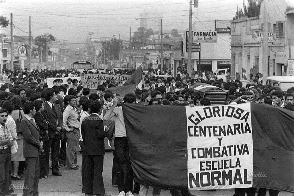 A lo largo de su historia, cientos de estudiantes y profesionales egresados de la Escuela Normal, por su entrega a los intereses populares, han sido encarcelados, torturados, desaparecidos y ejecutados, por fuerzas represivas al servicio de intereses hegemónicos. Fotografía de Rony Veliz, marcha normalista de protesta durante el sepelio del profesor Antonio Urizar.