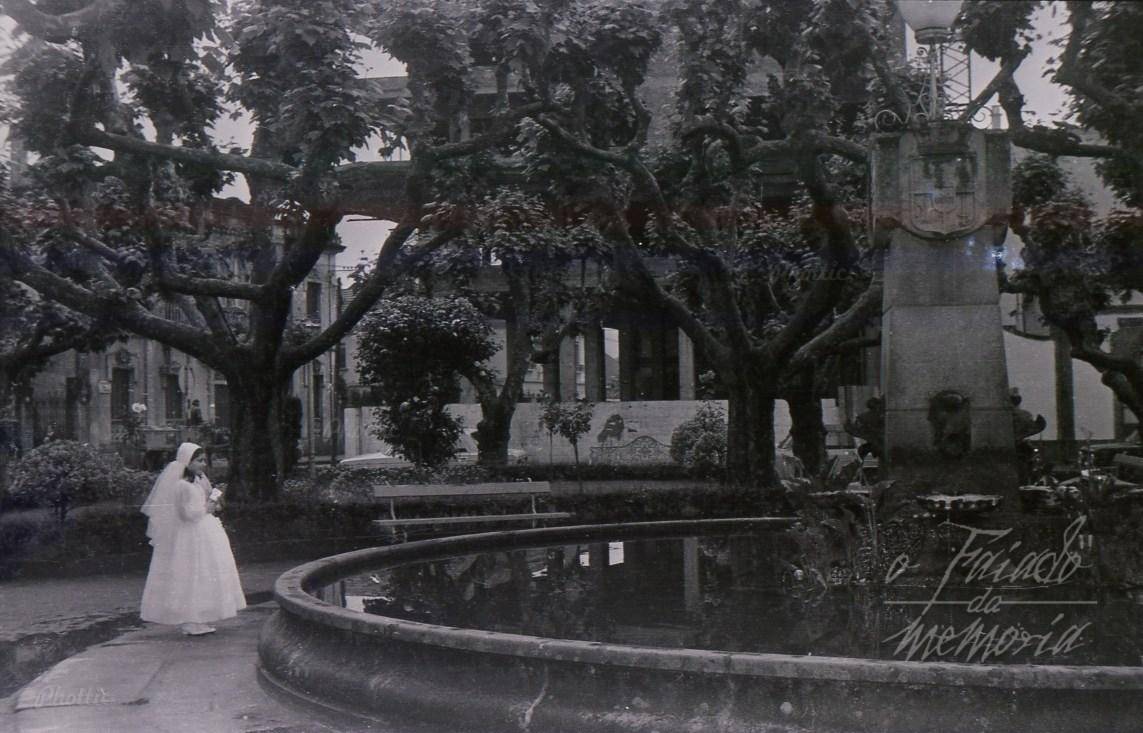A nena facia a sua primeira comunion, chovia, os arbores con pouca folla, a fonte da Praza de España