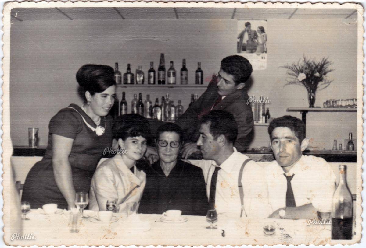De esquerda a dereita: Fina de Suárez, Fina de Carballoso, Emilia (nai de Isidro e Jaime), Isidro e Jaime de Belote. Atrás Pepe (fillo de Aurelia, unha irmá de Isidro e Jaime).