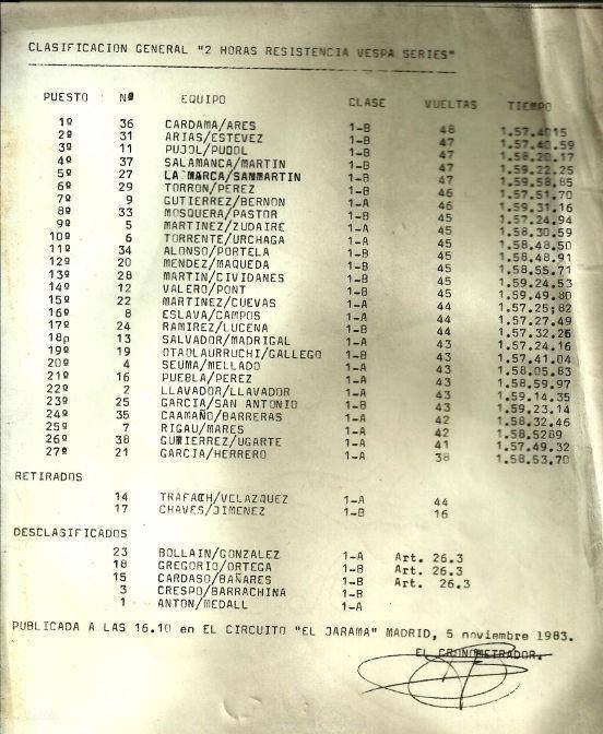 Folio original mecanografiado en la que se puede apreciar como el equipo formado por los vigueses Ares y Cardama se proclamó en noviembre de 1983 campeón de las dos horas de resistencia en vespa celebrada en el madrileño circuito del Jarama en la categoría "vespas de serie".