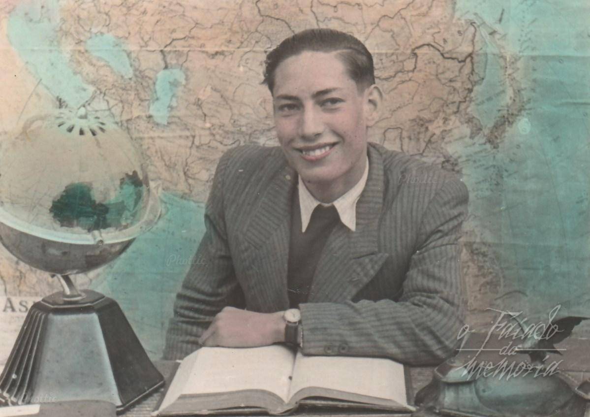 Rodolfo Blanco Rodriguez, retratandose na sua escola, atras o mapa-mundi protagonista da nosa infancia nas escolas
