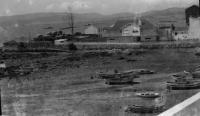 Esto é durante a festa do Carme. Antigamente a procesión marítima saía da fábrica. Por iso a engalanaban cos aparellos mariñeiros. Ano 1961.