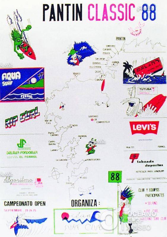 En 1988, organizado por el Océano Surf Club, se celebra en Valdoviño (España) el primer Pantín Classic. En la imagen, reproducción de aquel primer cartel que anunciaba el campeonato.