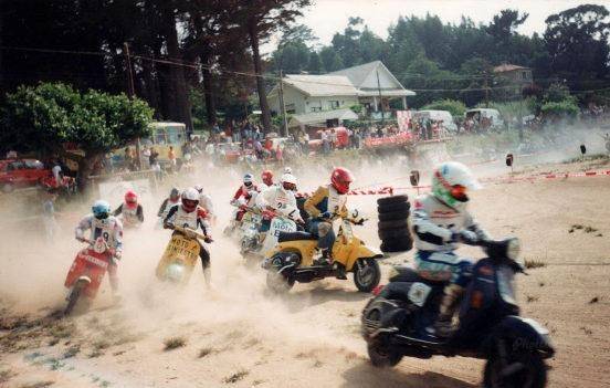En cualquier competición de velocidad, la primera curva suele marcar el devenir de la prueba. Los pilotos con la tensión propia de una competición, intentan tomarla a todo gas y lo más cerrada posible. Pero como todos no caben en la misma trazada, aquellos que salieron en una posición menos afortunada se abren intentando ganar posiciones. Esta fotografía en concreto corresponde al Vespaterra de Nigrán, celebrado en 1988. Los mejores pilotos gallegos, muchos de ellos mecánicos y propietarios de talleres, se dieron cita en esta histórica jornada. Sin forzar demasiado la vista podemos ver vespas de MOTO SINIESTRO, MOTO ELITE o de MANOLO VESPA.