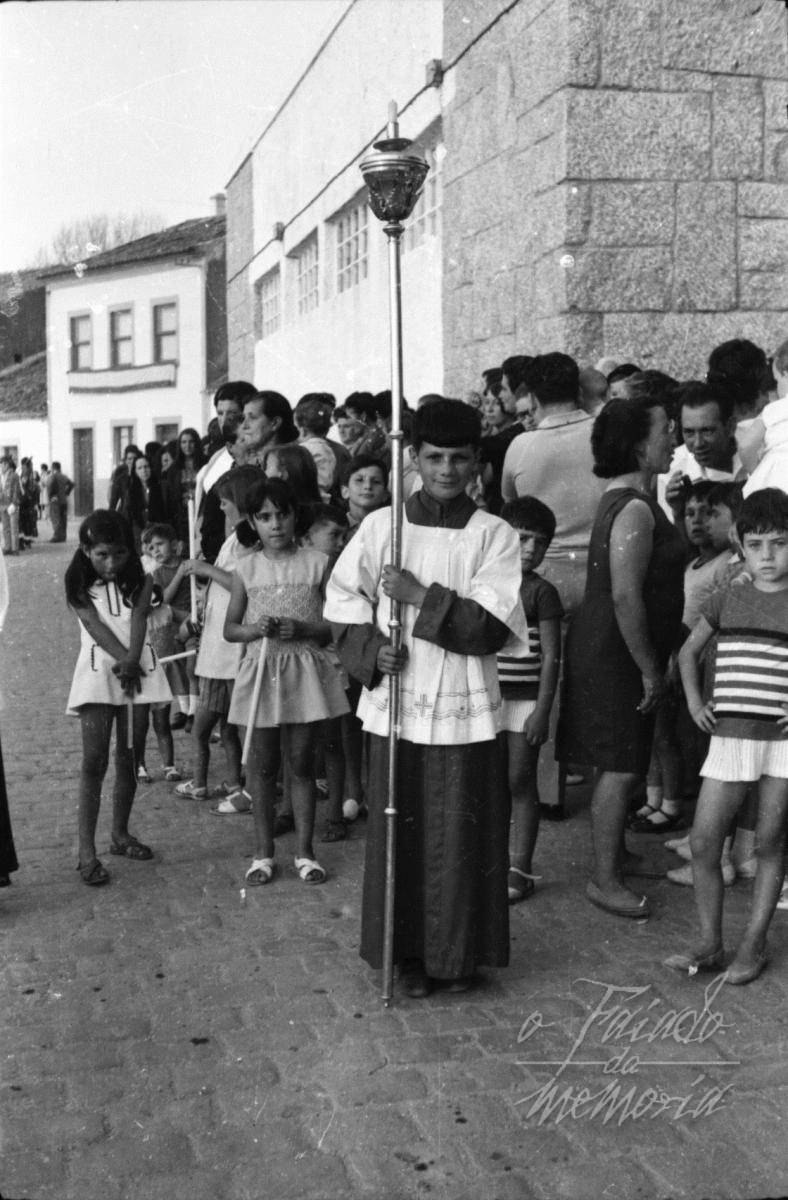 El monaguillo es mi primo Emilio Patiño Miguéns, y detrás, a su derecha, con sandalias blanas y una vela en la mano, está su hermana Mª Carmen Patiño Miguéns. El lugar, delante de la Plaza de Abastos de Vilaxoán, en la hoy llamada Rúa Avelina Nogueira.